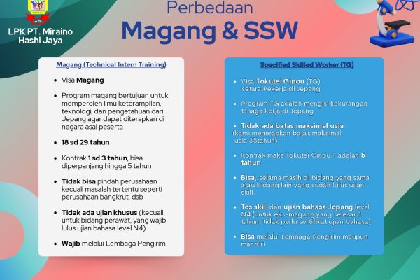 Pahami perbedaan mendasar antara program Magang (Ginou Jisshusei) dan SSW/Tokutei Ginou untuk menentukan jalur karir Anda di Jepang.