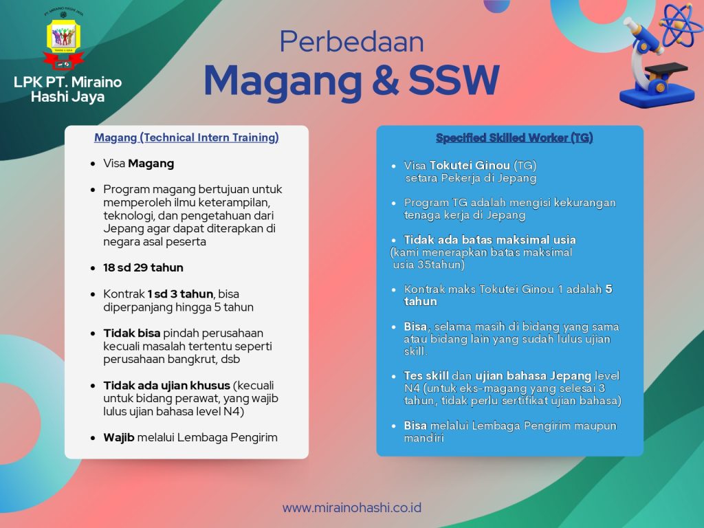 Bagi Anda yang berminat bekerja di Jepang, penting untuk memahami perbedaan antara dua program utama yang tersedia: Program Magang (Ginou Jisshusei/技能実習) dan SSW/Tokutei Ginou (特定技能).
